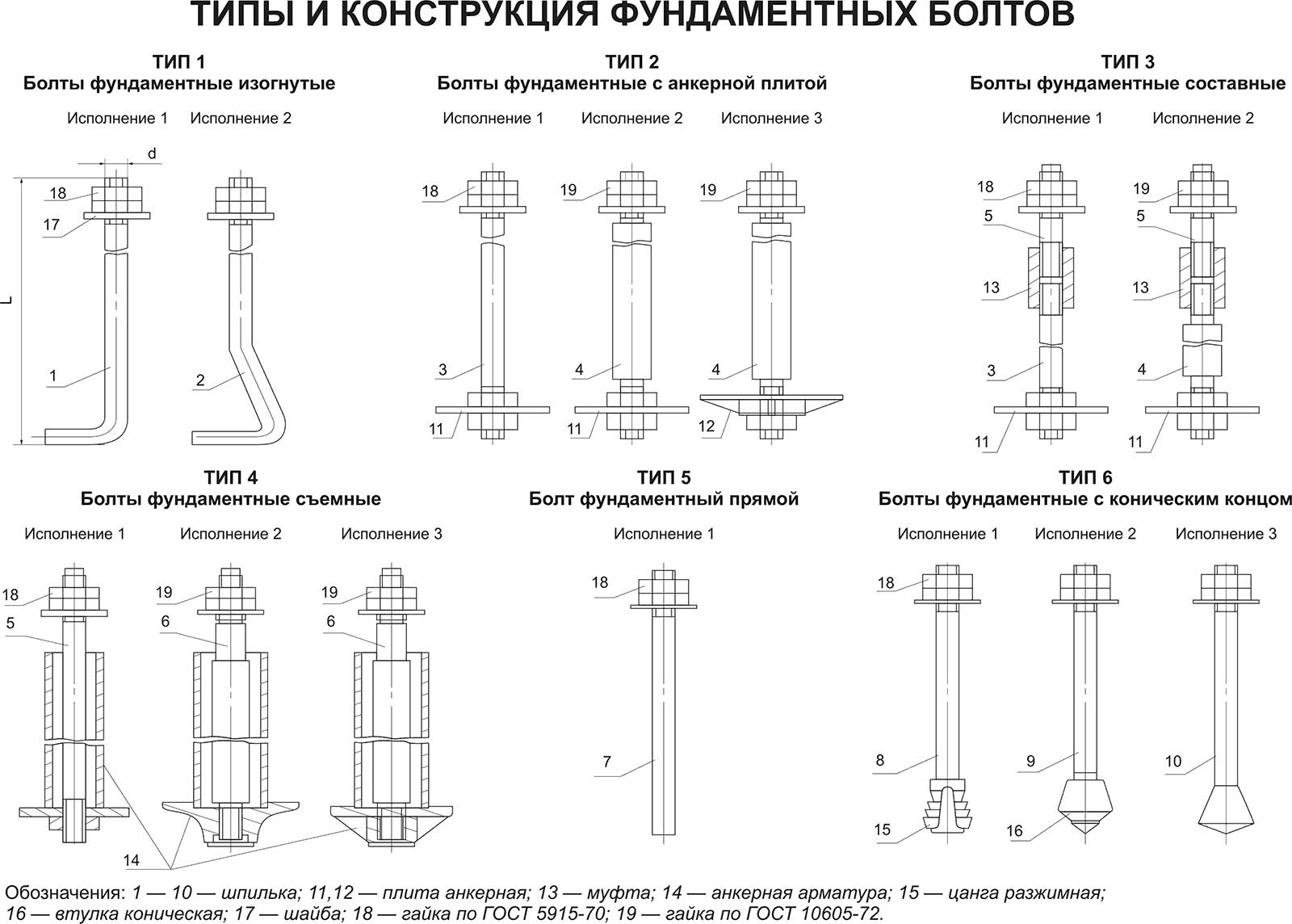 Болт фундаментный (или болт анкерный, анкер) – крепеж, представляющий собой стержень круглого сечения с резьбой на одном конце и специального приспособления на другом, которое позволяет установить болт  внутри фундамента (ГОСТ 24379.1-80). Исходя из особенностей исполнения данных болтов, выделяют  6 типов фундаментных болтов  (см. чертеж).