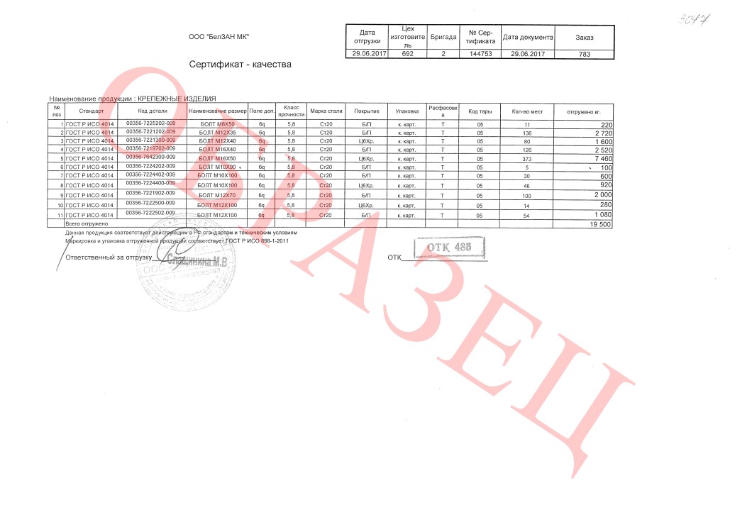 Класс прочности: 3,6; 4,6; 4,8; 5,8